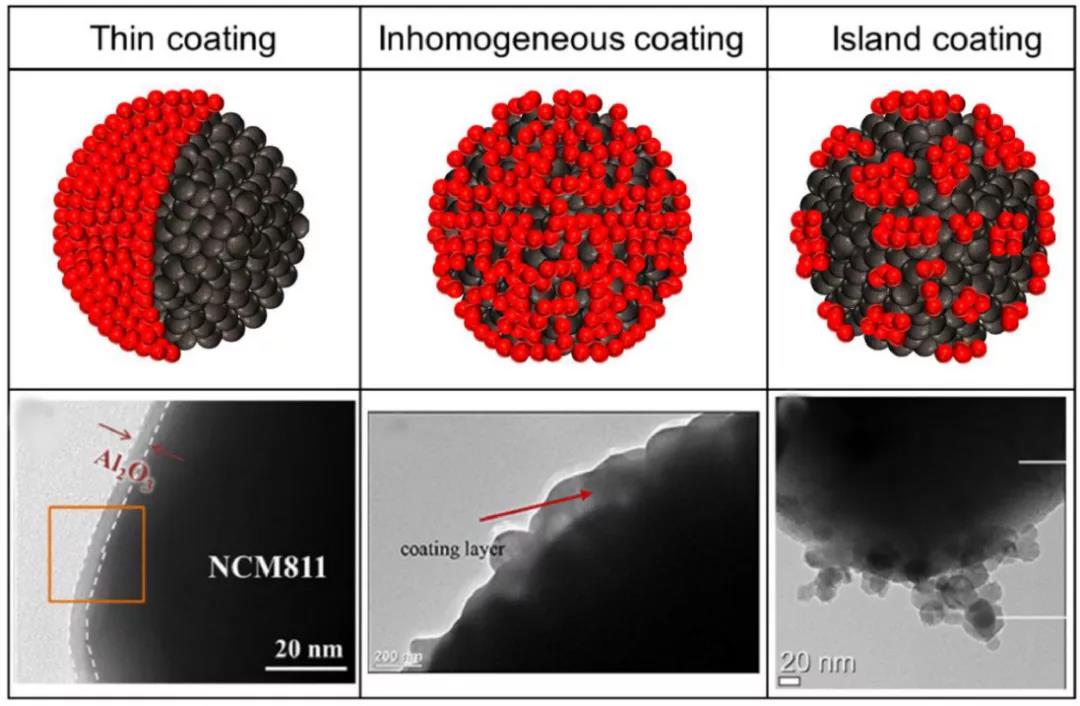 包覆層應(yīng)均勻且薄。正極顆粒的完全覆蓋將保護(hù)正極免受電解質(zhì)侵襲,抑制副反應(yīng)。此外,薄包覆層能提高界面處的動力學(xué),改善電池性能。