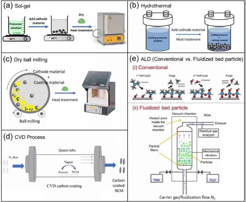 溶膠凝膠包覆工藝通常用于合成正極材料以及表面包覆。然而,由于使用水或其他溶劑,增加了成本。另外水之類的溶劑會導(dǎo)致鋰浸出并改變正極表面化學(xué)計(jì)量。