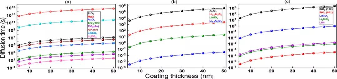 某些表面包覆會阻礙離子擴(kuò)散,但提供其他優(yōu)勢,而某些包覆可以增強(qiáng)離子擴(kuò)散,但損害其他性能。在采用包覆時(shí),折衷考慮這些影響一直是電池研究的重點(diǎn)。包覆厚度與包覆層的鋰離子擴(kuò)散率之間的結(jié)構(gòu)特性相關(guān)性是衡量折衷標(biāo)準(zhǔn)的一個有效方法。圖10提供了擴(kuò)散時(shí)間與包覆厚度的關(guān)系。大多數(shù)氧化物和氟化物的鋰離子擴(kuò)散率極低。對于較厚的包覆,擴(kuò)散時(shí)間更長。這些表面包覆厚度應(yīng)小于10nm,以獲得更好的電化學(xué)性能。