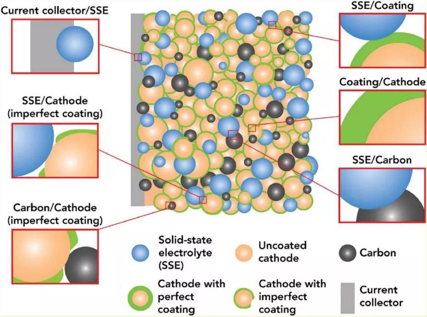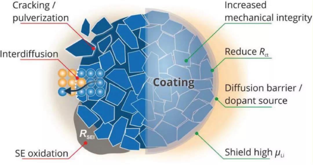 總之,SSB中正極包覆層應(yīng)具有以下特性:1)提供物理屏障,防止副反應(yīng);2)防止相互擴(kuò)散,抑制電阻性界面的形成;3、電子電導(dǎo)率低,避免SE的氧化還原反應(yīng);4)高的離子電導(dǎo)率,改善界面處的電荷轉(zhuǎn)移;5)良好的機(jī)械性能,適應(yīng)正極材料的體積變化,并防止接觸損失;6)降低界面電阻。